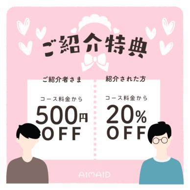 お知らせ ご紹介特典のお知らせ ❁ ご紹介特典のご案内 ❁アイメイドでは、たいせつな方を紹介してくださったご主人様・お嬢様に、ささやかな特典をご用意しております。🌸 ご紹介者さまには…・500円OFFコース料金を割引させていただきま... 2025.06.30 お知らせ本店